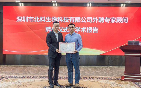2022年10月18日,深圳市北科生物科技有限公司舉行了外聘專家顧問聘任儀式暨學(xué)術(shù)報(bào)告。北科生物董事長(zhǎng)胡雋源博士為中國(guó)醫(yī)學(xué)科學(xué)院阜外醫(yī)院心血管疾病國(guó)家重點(diǎn)實(shí)驗(yàn)室王志華教授頒發(fā)外聘專家顧問證書。王志華教