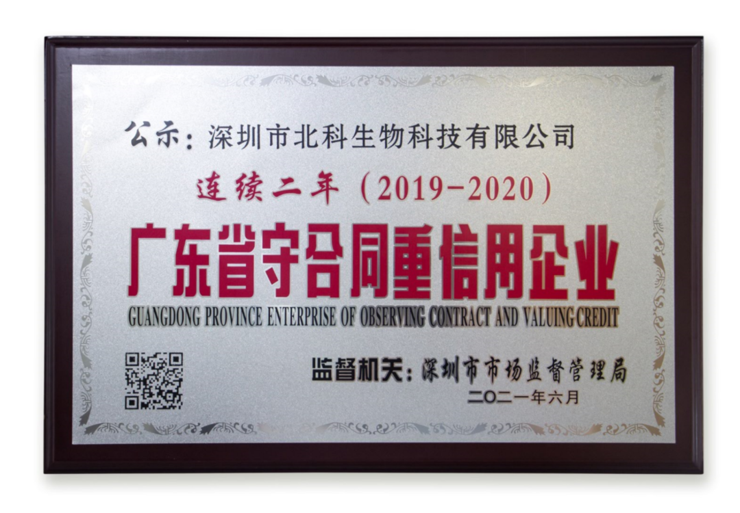 近日,廣東省市場監督管理局公布了2020年度廣東省守合同重信用企業名單。深圳市北科生物科技有限公司順利通過最終評審,連續兩年榮獲“廣東省守合同重信用”榮譽稱號,并獲頒榮譽證牌匾和榮譽證書?!皬V東省守合