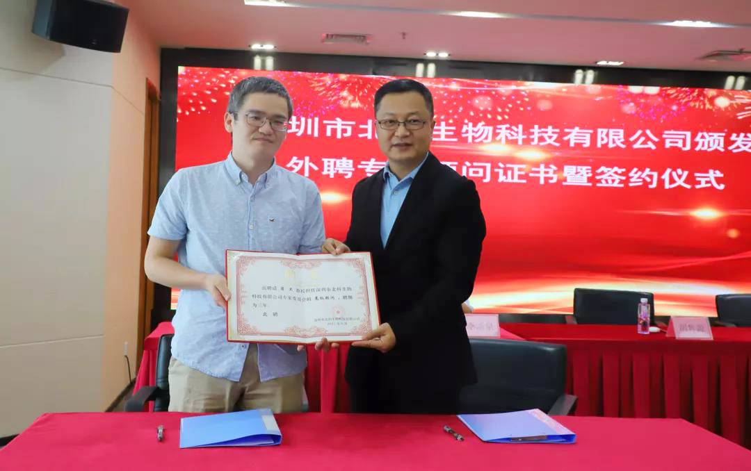 9月29日下午,為推動公司實現高質量的發展,提升公司的核心競爭力,深圳市北科生物科技有限公司舉行了頒發外聘專家顧問證書暨合作項目簽約儀式。北科生物董事長胡雋源博士與蔣衛教授簽訂《合作項目意向書》并頒發