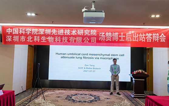 7月27日,由中國科學院深圳先進技術研究院與深圳市北科生物科技有限公司聯合培養的博士后湯贊博士出站答辯會在北科大廈舉行。答辯會上,湯贊博士匯報了題為《臍帶間充質干細胞通過巨噬細胞緩解肺纖維化》的出站答