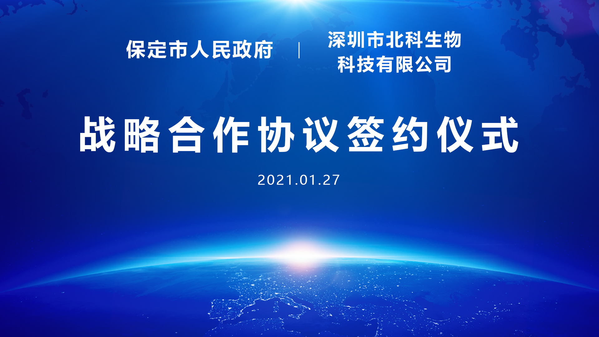 1月27日,保定市人民政府召開重點合作項目云簽約儀式,與深圳市北科生物科技有限公司(以下簡稱“北科生物”)成功簽署戰(zhàn)略合作協(xié)議。雙方將積極發(fā)揮自身資源和優(yōu)勢,共同為保定打造生命健康產業(yè)及國家醫(yī)療中心,推動保定產業(yè)升級和打造特色醫(yī)療品牌貢獻力量。由于疫情原因,簽約儀式在線上舉行,河北省保定市市委書記黨曉龍致辭,市長郭建英主持, 市委常委、常務副市長李國勇代表市政府與北科生物董事長胡雋源博士完成簽約。