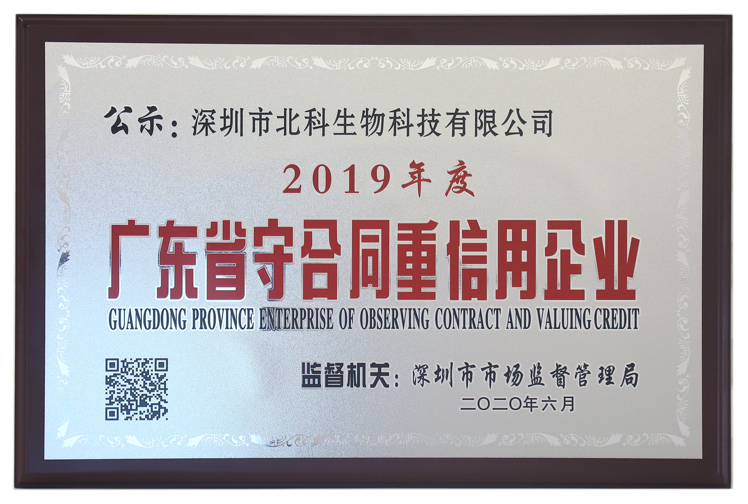 近日,廣東省市場監督管理局公布了2019年廣東省守合同重信用企業名單。北科生物憑借嚴謹創新的企業理念、誠實守信的經營原則和良好的社會信譽等方面的優異成績,被授予“2019年廣東省守合同重信用企業”的榮譽稱號。