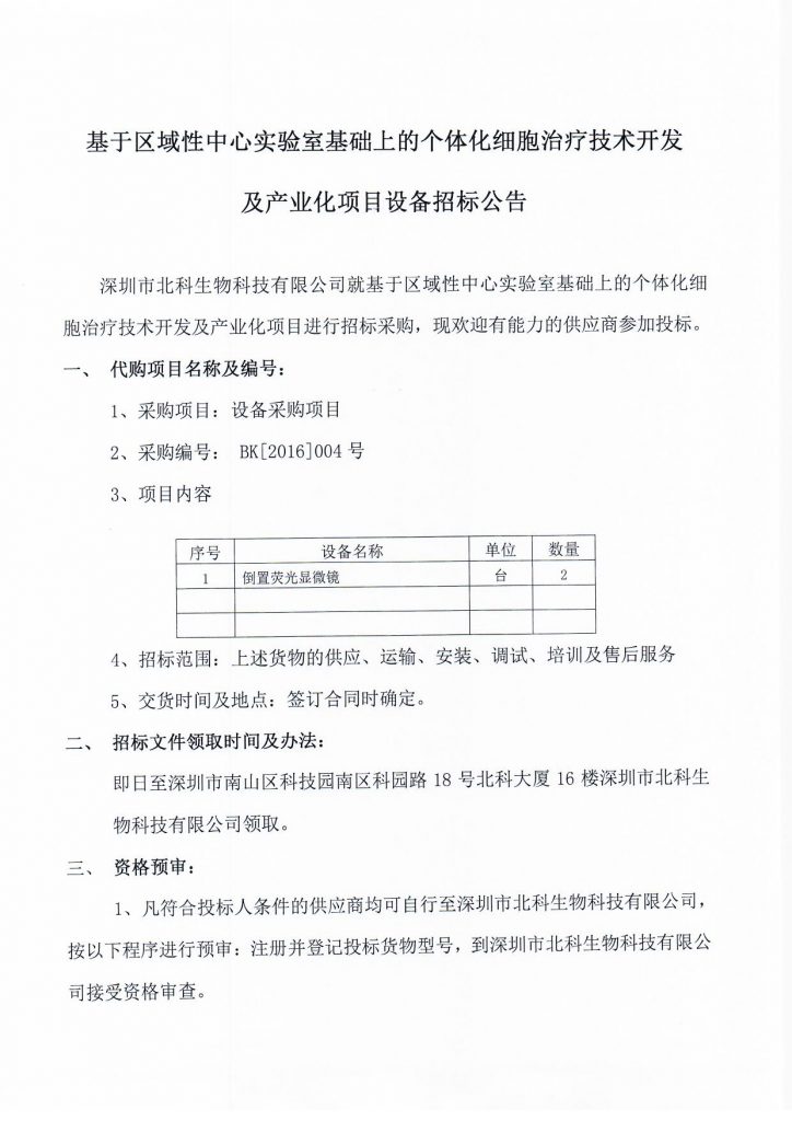 基于區域性中心實驗室基礎上的個體化細胞治療技術開發及產業化項目設備招標公告