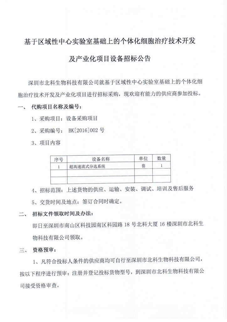 基于區域性中心實驗室基礎上的個體化細胞治療技術開發及產業化項目設備招標公告
