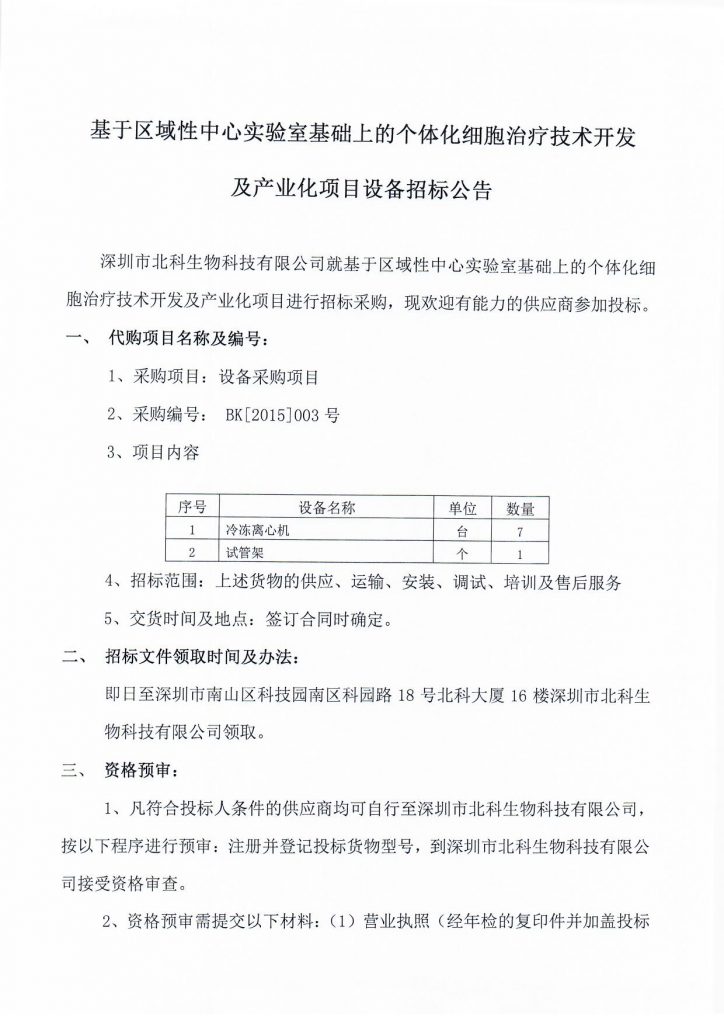 基于區域性中心實驗室基礎上的個體化細胞治療技術開發及產業化項目設備招標公告