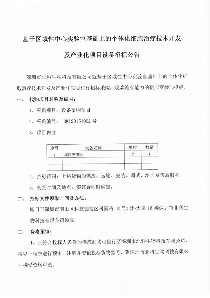 基于區域性中心實驗室基礎上的個體化細胞治療技術開發及產業化項目設備招標公告