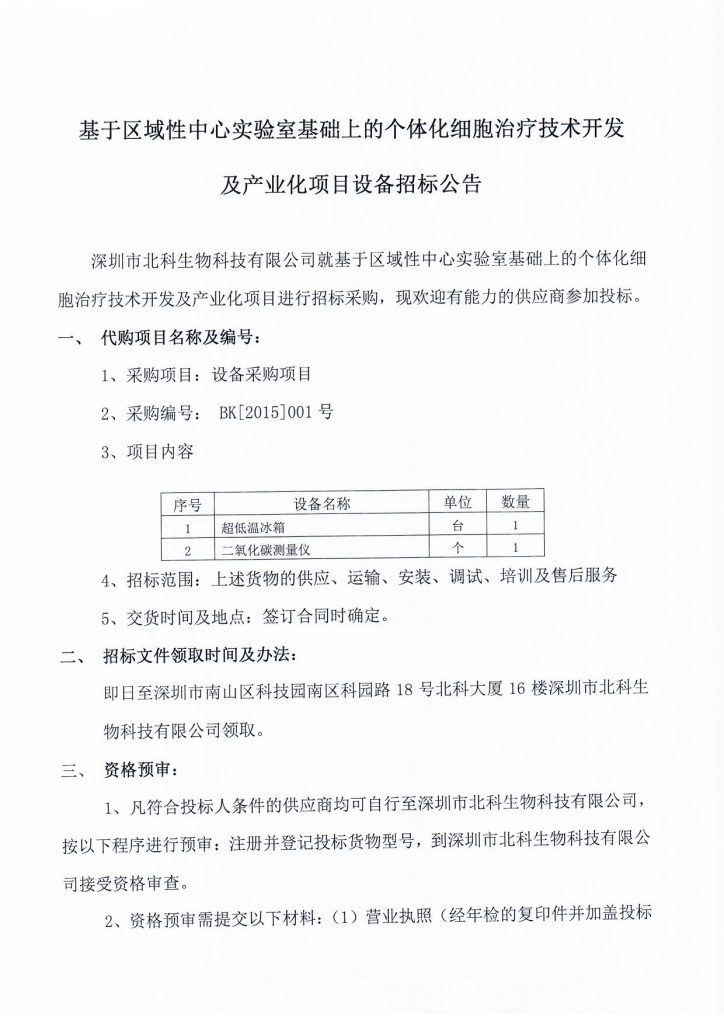 基于區域性中心實驗室基礎上的個體化細胞治療技術開發及產業化項目設備招標公告