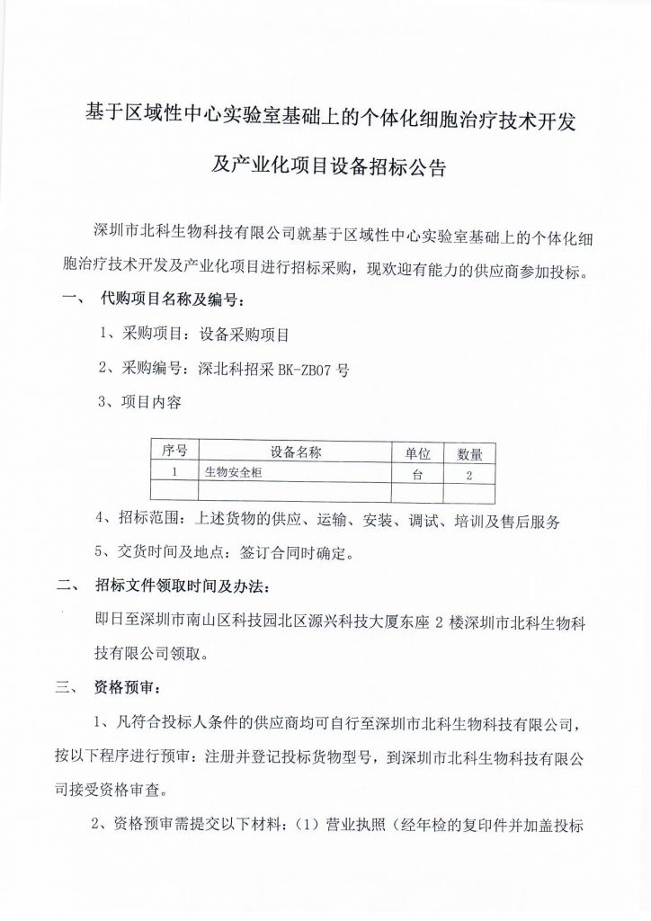 基于區域性中心實驗室基礎上的個體化細胞治療技術開發及產業化項目設備招標公告