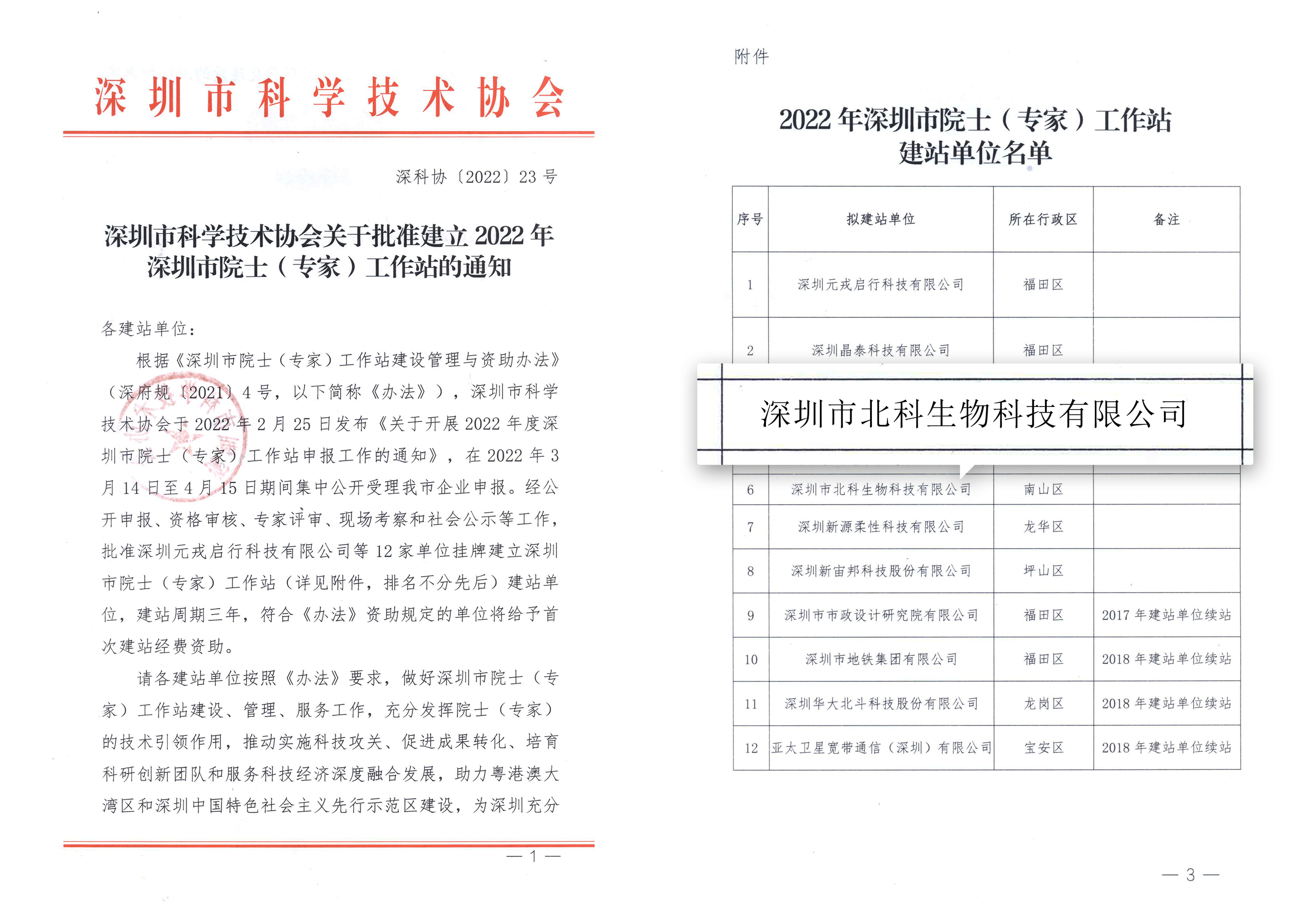 2022年6月27日,深圳市科學技術協會發布通知,按照《深圳市院士(專家)工作站建設管理與資助辦法》(深府規〔2021〕4號)有關要求,經過公開申報、資格審核和專家評審、現場考察和社會公示等工作,同意深圳市北科生物科技有限公司建立深圳市院士(專家)工作站。