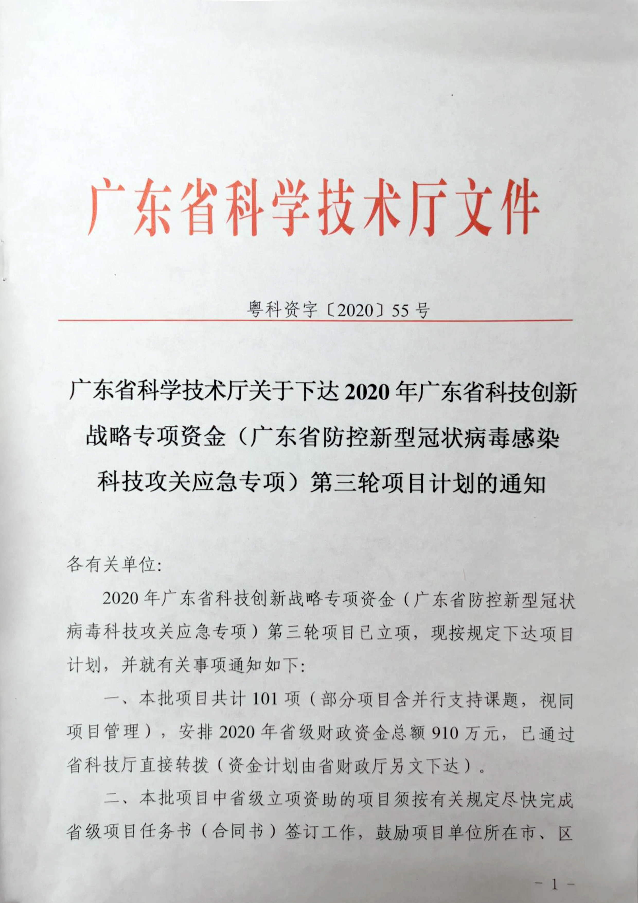 重磅!北科生物獲廣東省防控新冠病毒感染科技攻關應急專項立項