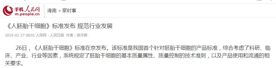 人民網(wǎng)報(bào)道:《人胚胎干細(xì)胞》標(biāo)準(zhǔn)發(fā)布 規(guī)范行業(yè)發(fā)展