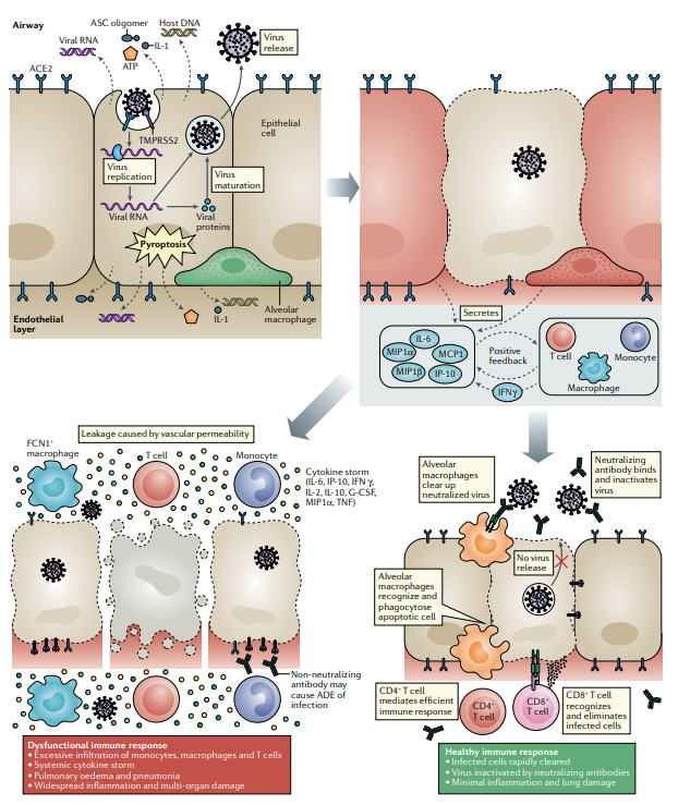 2019年底爆發(fā)的新型冠狀病毒,是一種人群普遍易感的病毒類型,以肺部病變?yōu)橹鳎腥咎卣鳛榘l(fā)熱、干咳、氣促、肺部有炎癥性改變等。由于對新冠病毒感染缺乏有效的治療藥物,臨床主要依靠對癥支持治療為主,部分患者在肺炎進入進展期后,容易發(fā)生急性呼吸窘迫綜合征而危及生命。而由于自身免疫細(xì)胞識別并攻擊病毒,重癥患者體內(nèi)可能會誘發(fā)強烈的免疫反應(yīng),肺部出現(xiàn)多種且大量的炎癥細(xì)胞因子,體內(nèi)免疫平衡破壞,最終導(dǎo)致肺部器官嚴(yán)重?fù)p傷,出現(xiàn)嚴(yán)重的呼吸障礙(圖1)。