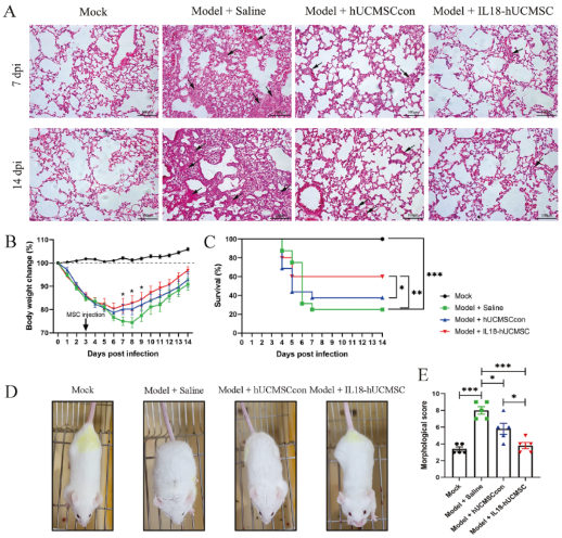在本研究中,研究人員發(fā)現(xiàn)通過使用炎癥因子IL-18在體外培養(yǎng)階段“賦能”臍帶MSCs,可以在體外實驗中有效增強對T細(xì)胞的免疫調(diào)節(jié)作用;在體內(nèi)實驗中緩解病毒引起的肺部重癥炎癥,從而減少肺部損傷、提高病毒性肺炎模型小鼠的生存率,且改善多種臨床表現(xiàn)(圖2)。